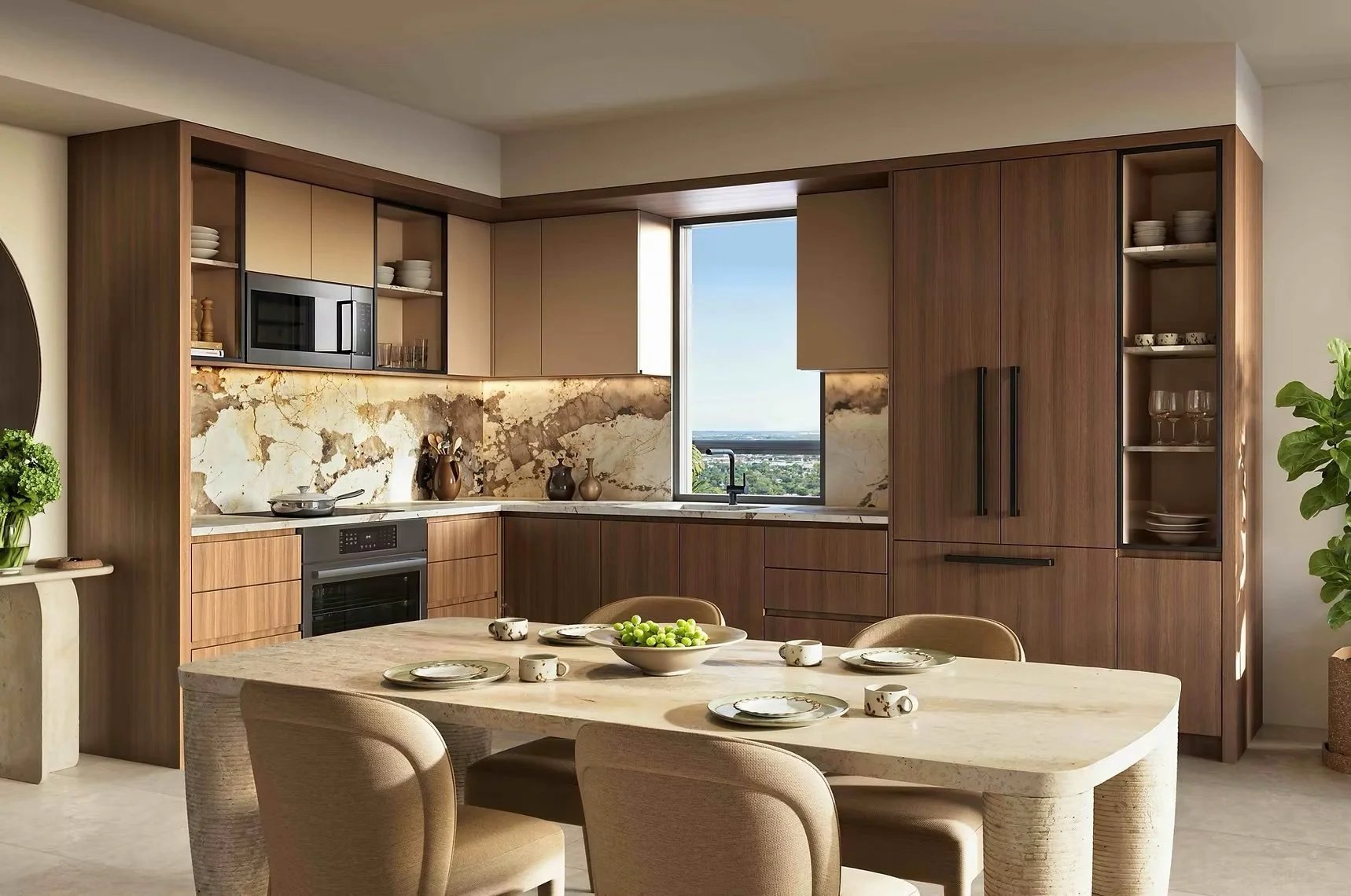 Residences range from studios to three-bedroom layouts, spanning 552 to 1,412 square feet. Each home features expansive balconies with glass railings and floor-to-ceiling windows that enhance natural light and views. Interiors include imported porcelain flooring throughout and kitchens designed with custom Italkraft cabinetry in a warm tobacco walnut finish, tinted glass accents, brushed black chrome Hansgrohe fixtures, quartz countertops with seamless backsplashes, and fully integrated Bosch appliances. Bathrooms continue the refined aesthetic with contemporary Italkraft cabinetry, quartz surfaces, porcelain tile walls and floors, and Hansgrohe fixtures.