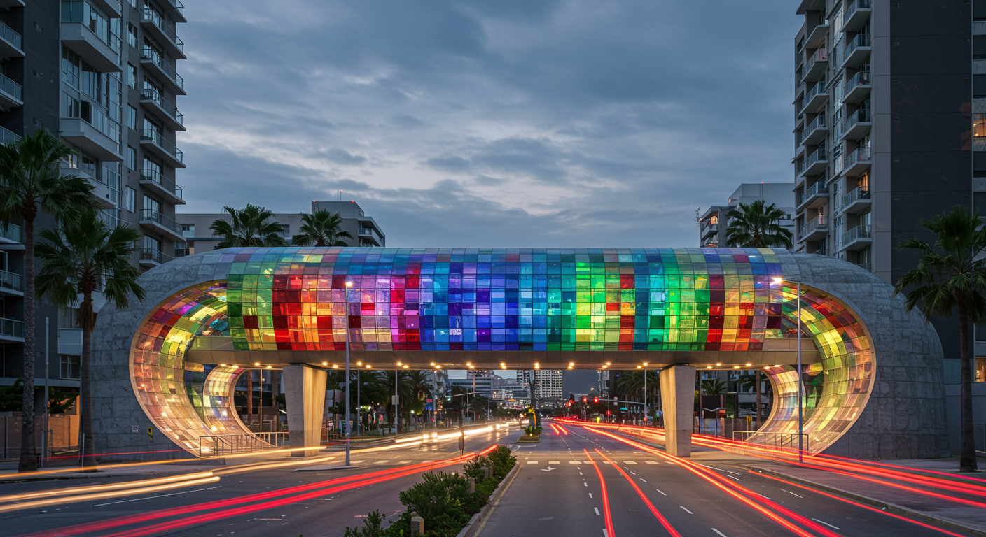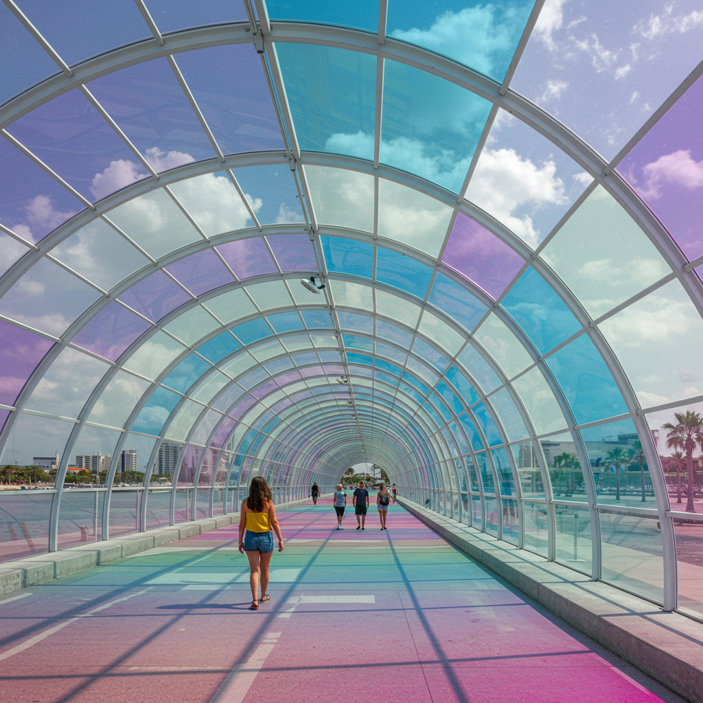 The upcoming Canopy Bridge, set for groundbreaking in early 2024 and designed by Daniel Buren, will be a 158-foot-long enclosed pedestrian bridge connecting Five Park to the South of Fifth neighborhood, adding a unique structural and artistic element to the development.