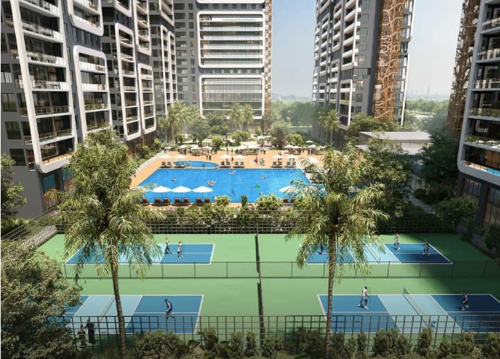 The project, named Holland Park and designed by Arquitectonica, will include two nine-level parking garages with 4,249 spaces, over 57,000 square feet of retail space, and a freestanding single-story amenities building. Renderings depict slate-colored buildings with white vertical elements for a striking visual impact. The development will also boast a central plaza with two pools, tennis courts, and an open park, with retail storefronts lining the street-facing exterior across four city blocks.