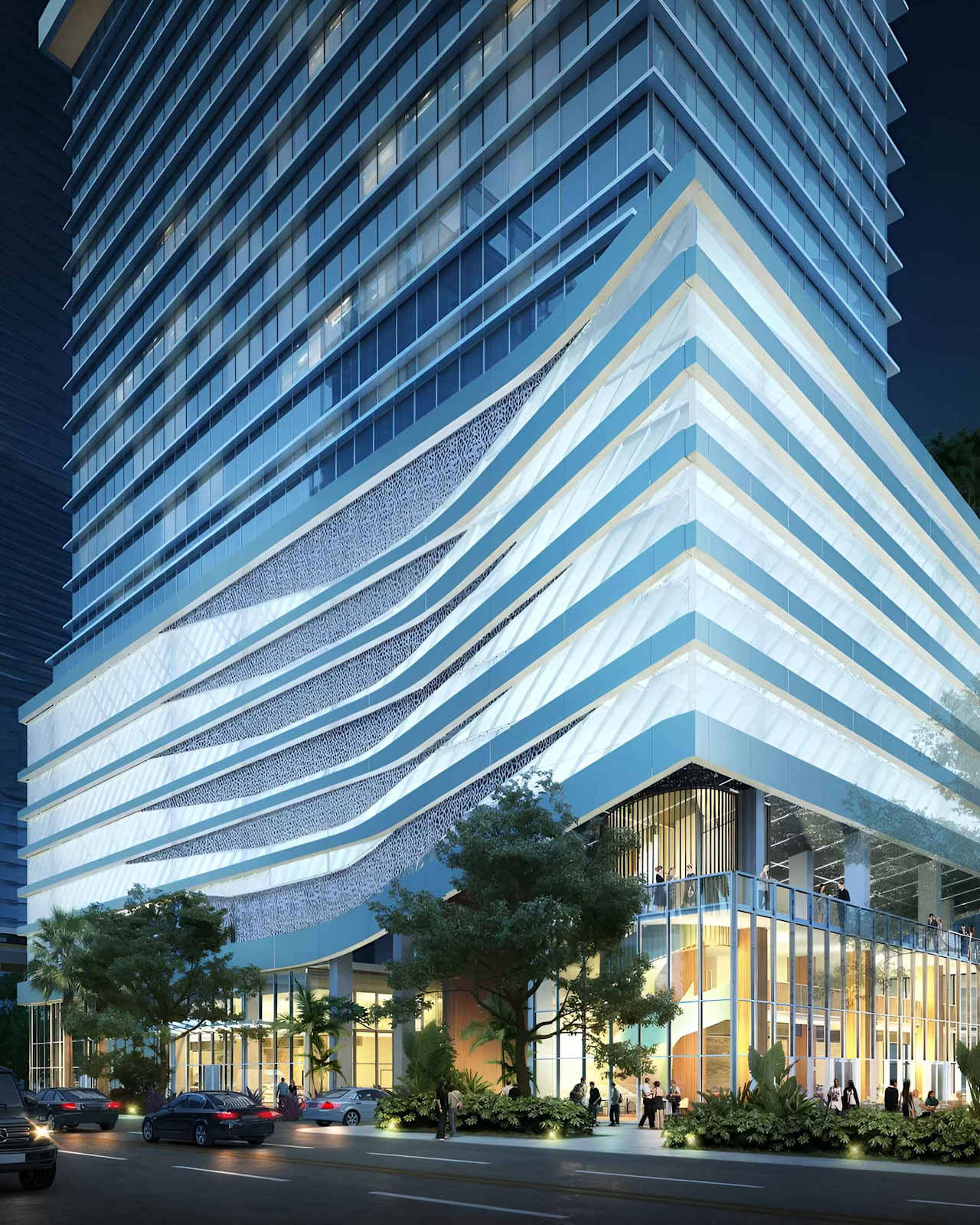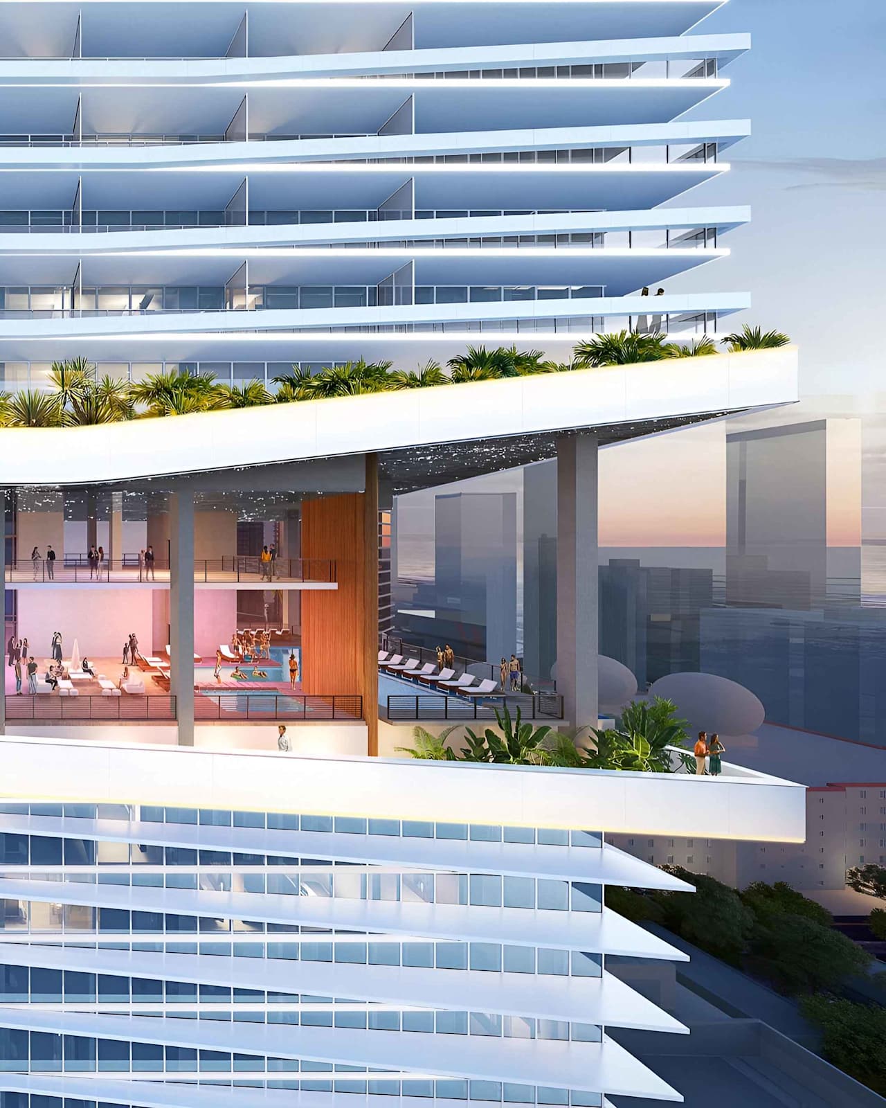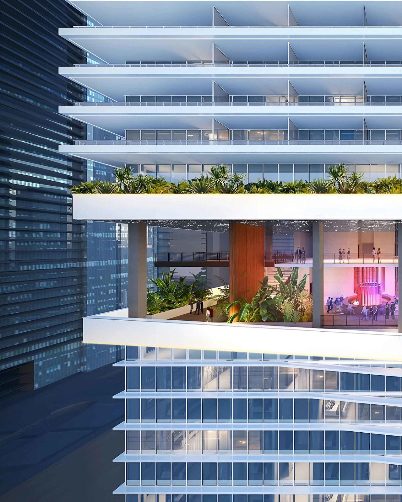 The tower will boast a diverse array of offerings, blending retail, dining, residential, and hotel components. The ground and mezzanine floors will house retail spaces and a two-story restaurant that spills onto the promenade, supplemented by additional parking. Above, the building will feature a hotel with generous meeting space and residential units offering access to exclusive amenities, including two pool decks. Residents will enjoy a private retreat on the 10th floor, while a 25th-floor hotel pool deck will feature a bar, lounge, and breathtaking city views.