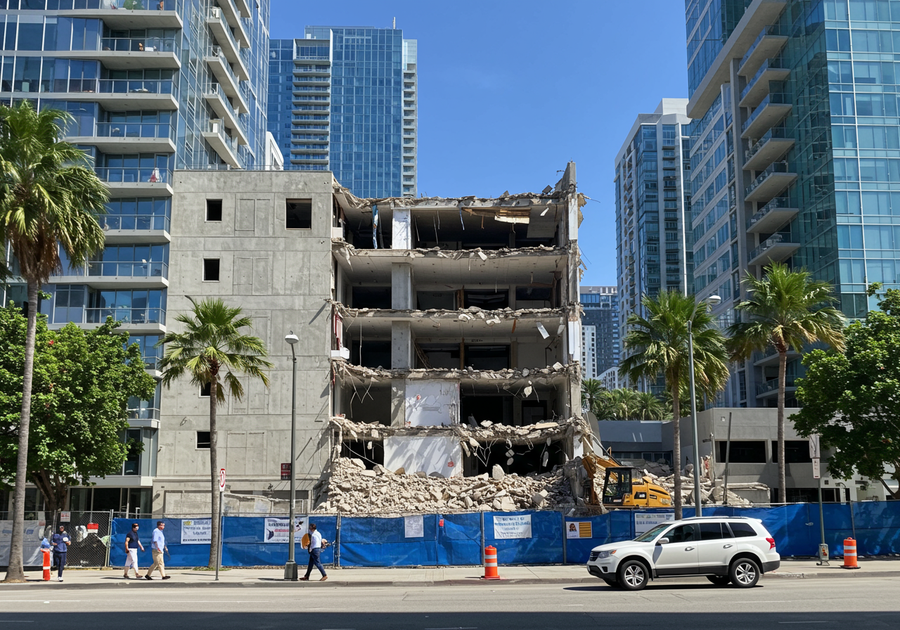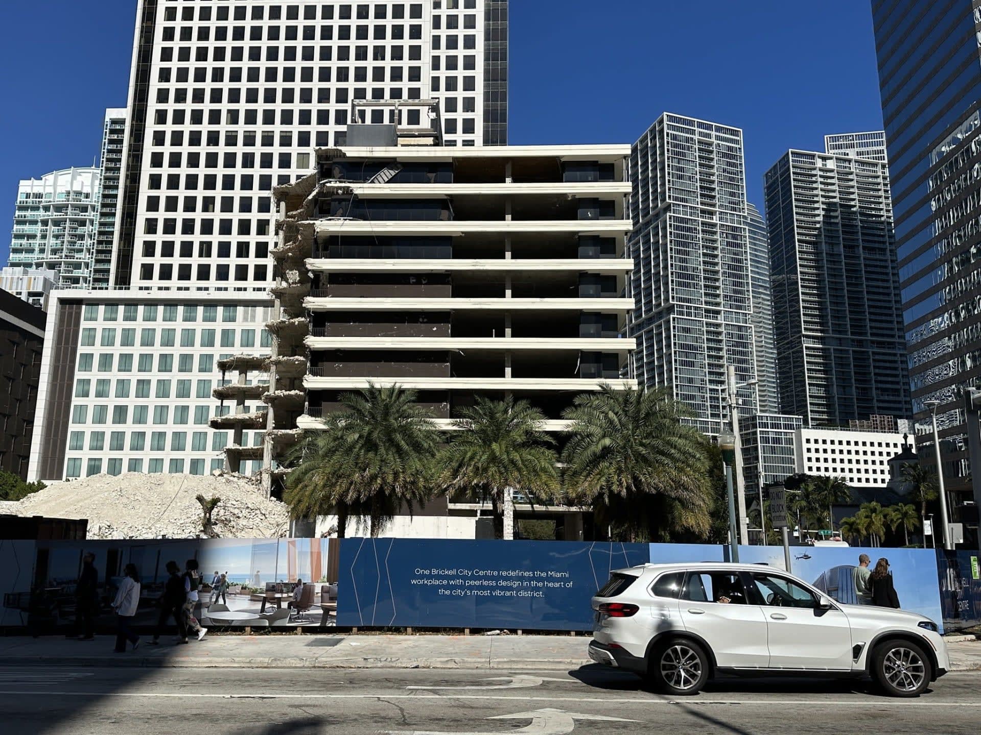 The demolition of an office building at the site of the One Brickell City Centre, a near-supertall development, is still in progress.