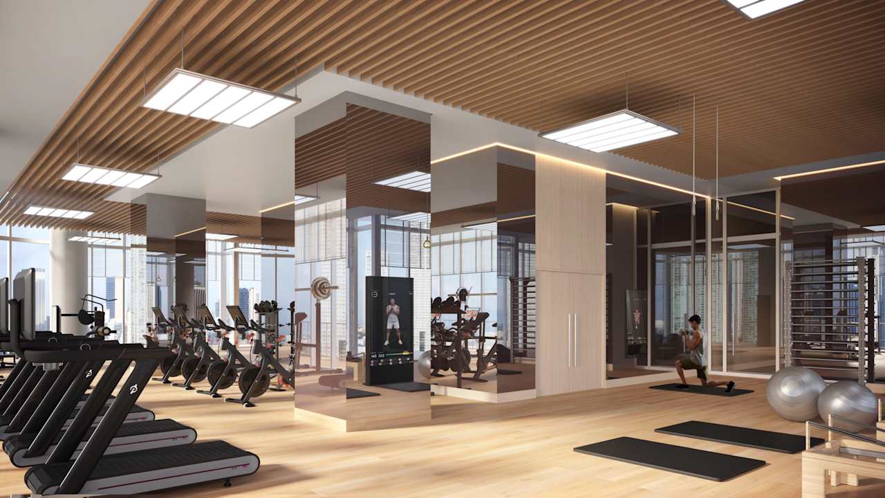 State-of-the-art gym with instructor-led classes, a rooftop pool, cabanas, poolside service, and lounges in the sun and shade.